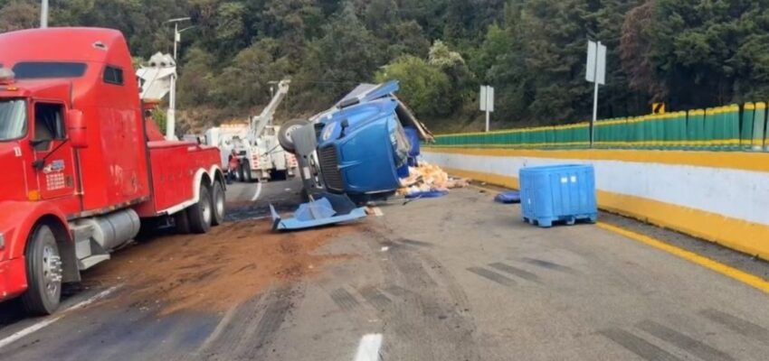 Este martes, un tráiler volcó en la curva conocida como La Pera, en la autopista México-Cuernavaca, ocasionando afectaciones viales, con filas kilométricas de autos.