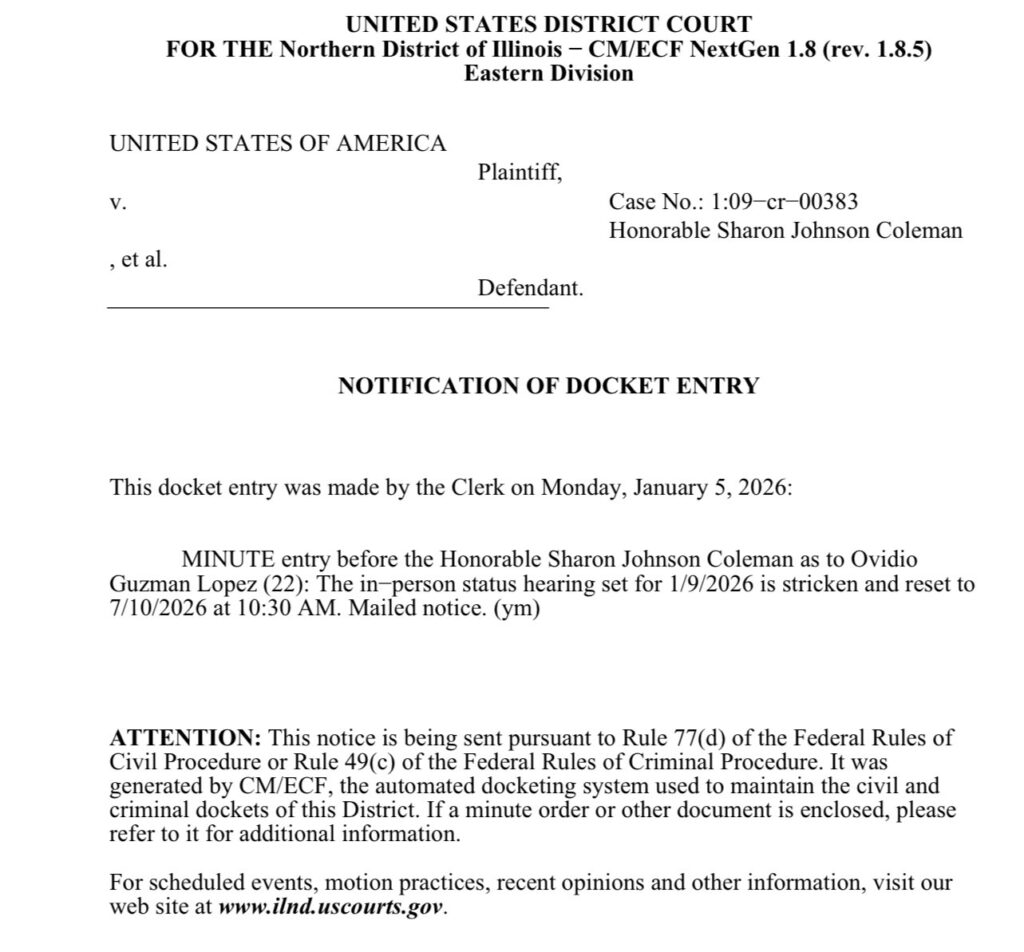 La Corte del Distrito Norte de Illinois, en Chicago, Estados Unidos, aplazó por seis meses la audiencia de Ovidio Guzmán López. La comparecencia, programada originalmente para el próximo viernes se pospuso hasta el 10 de julio a las 10:30 horas (tiempo local).